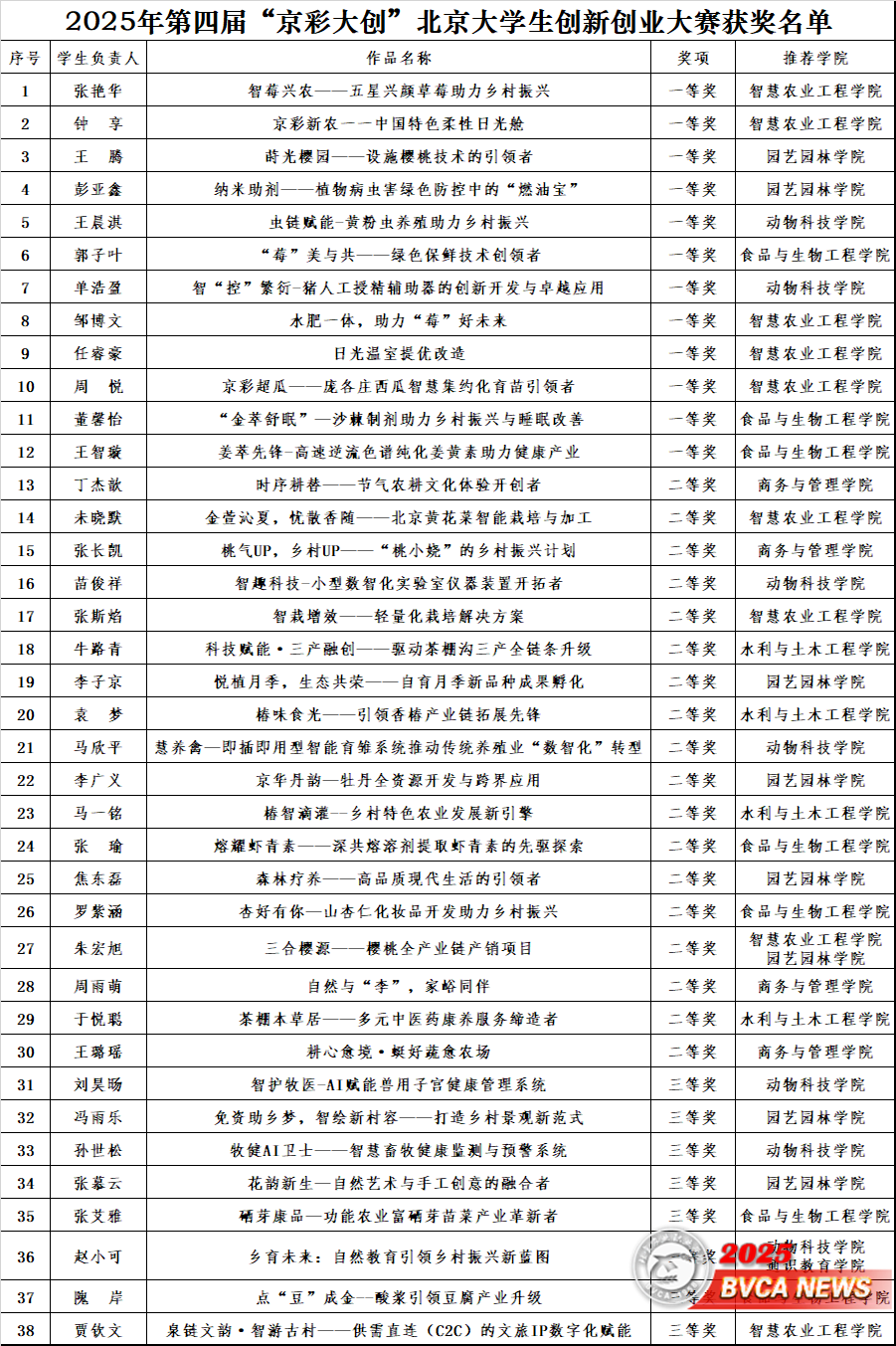 近日,第四屆“京彩大創(chuàng)”北京大學(xué)生創(chuàng)新創(chuàng)業(yè)大賽圓滿落幕。學(xué)校捷報頻傳,38支團隊脫穎而出,斬獲一等獎12項、二等獎18項、三等獎8項。園藝園林學(xué)院推薦的《蒔光櫻園》項目成功晉級北京市總決賽,大賽成績呈現(xiàn)出“數(shù)量突破、質(zhì)量提升、層次躍進”的良好態(tài)勢,充分彰顯了我校作為農(nóng)業(yè)特色高職院校在“雙創(chuàng)”領(lǐng)域的強勁實力。