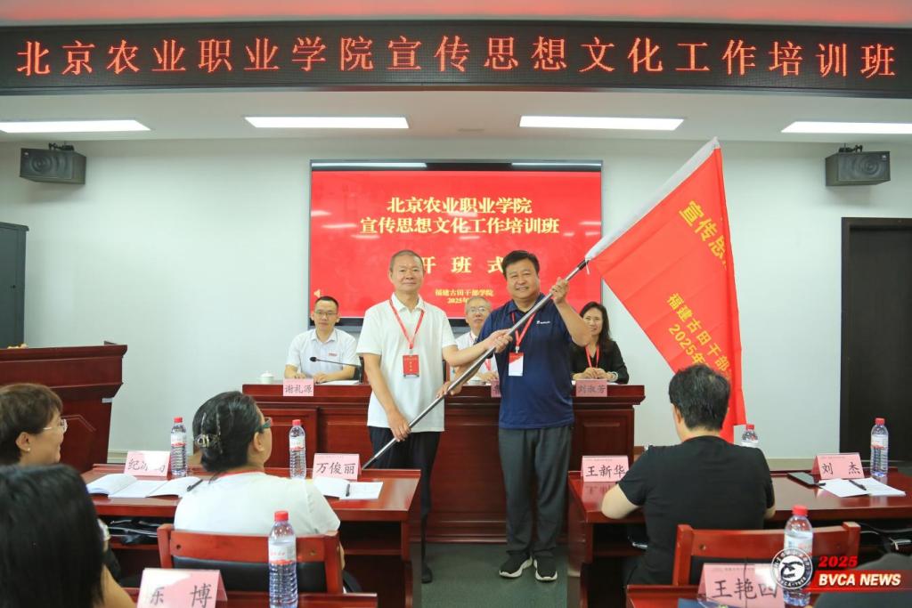 周志成為培訓(xùn)班授班旗,通識(shí)教育學(xué)院黨總支書(shū)記劉杰代表培訓(xùn)班接旗。