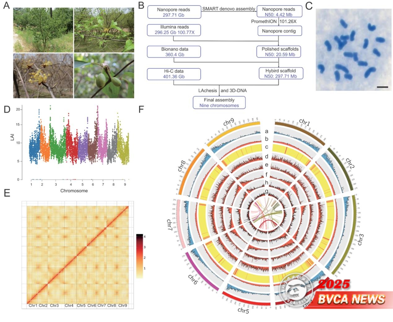 為破解這一難題,團隊采用多方法整合策略,聯合二代與三代測序技術,并結合Hi-C技術和BioNano光學圖譜技術,成功組裝了山茱萸染色體水平的高質量參考基因組(2n = 18),其基因組大小為2.96 Gb,N50長度達297.71 Mb,重復序列占比達75.04%,共注釋到了41,911個蛋白編碼基因(圖1)。