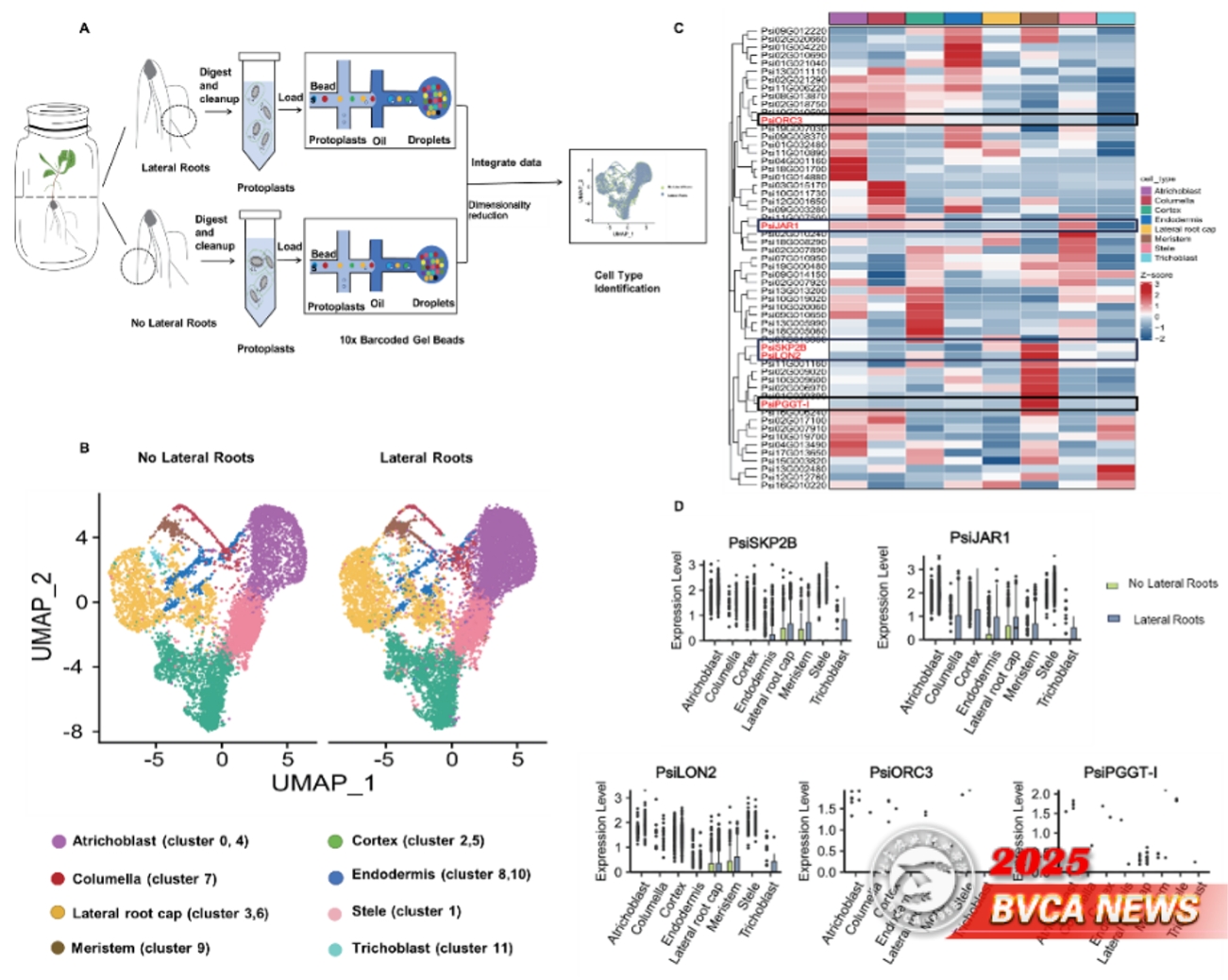 進一步,利用單細胞轉錄組測序,成功注釋了楊樹根系的8種主要細胞類型,包括非成毛體細胞、中柱細胞、皮層細胞、側根冠細胞、中央根冠細胞、內皮層細胞、分生細胞和成毛體細胞,構建了首個楊樹根系單細胞轉錄圖譜。發現上述72個根系發育候選基因呈現出細胞特異性表達模式。其中,PsiSKP2B在分生細胞與側根冠細胞中具有較高表達水平,該空間表達特征有效支撐了GWAS研究結果,為在單細胞分辨率下揭示PsiSKP2B的遺傳調控機制提供了細胞學證據。