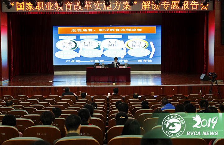 4月19日,清華大學聯合博士生導師,國家教育行政學院學術委員會主任、職業教育研究中心主任邢暉教授應邀來學院作題為《高等職業教育新號角、新行動》——《國家職業教育改革實施方案》解讀報告會。黨委副書記杜保德主持報告會,學院教職員工近800人參會。