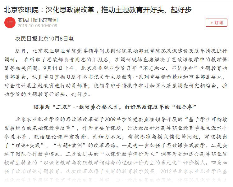 自2012年以來,北京農業(yè)職業(yè)學院堅持扎實落實教改成果并不斷完善階段。創(chuàng)新提出并實踐了“理論+實踐,專題+案例”的改革思路。 在“理論+實踐”這一環(huán)節(jié)上,堅持“理論講授有深度,實踐環(huán)節(jié)有溫度”,在學生中廣泛開展了“身邊的社會調研”、“課前的時事報道”等實踐環(huán)節(jié),堅持學生外出調研考察,以社會實踐中的鮮活事例和生動體驗影響學生,增強對學生的感性教育。“專題+案例”方面,學院黨委堅持將案例教學應用到思政課中,要求課程內容貼近現實,針對農業(yè)職業(yè)院校學生特點做好教學設計。