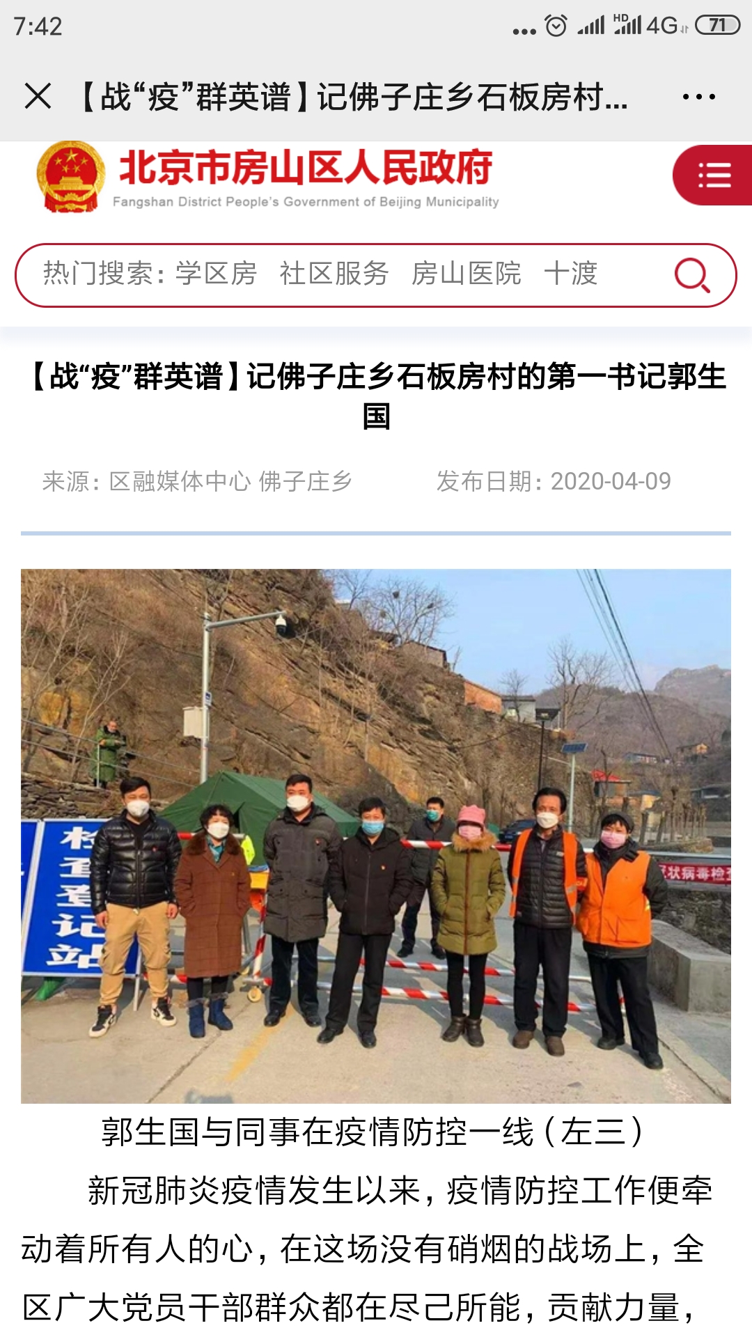 4月9日房山區政府官網:【戰“疫”群英譜】記佛子莊鄉石板房村的第一書記郭生國