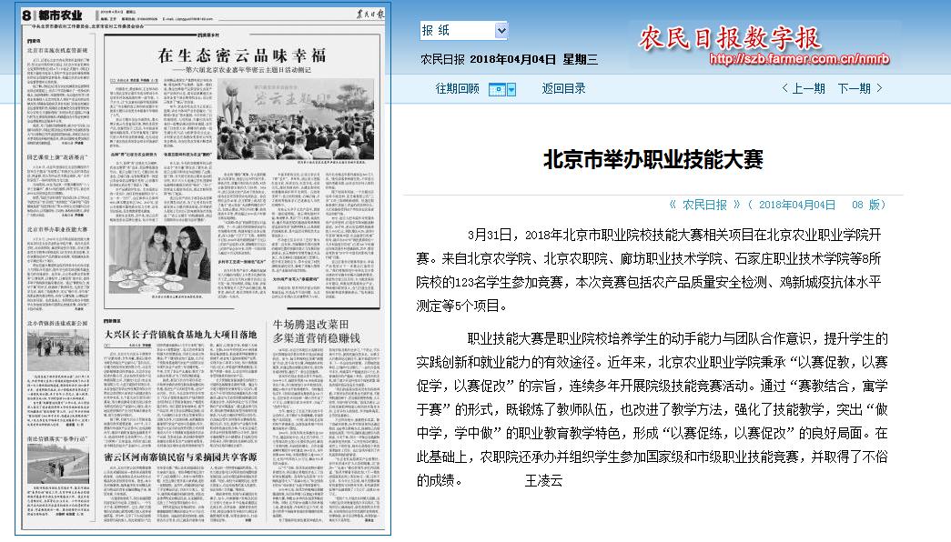 3月31日,2018年北京市職業(yè)院校技能大賽相關(guān)項(xiàng)目在北京農(nóng)業(yè)職業(yè)學(xué)院開賽。來自北京農(nóng)學(xué)院、北京農(nóng)職院、廊坊職業(yè)技術(shù)學(xué)院、石家莊職業(yè)技術(shù)學(xué)院等8所院校的123名學(xué)生參加競賽,本次競賽包括農(nóng)產(chǎn)品質(zhì)量安全檢測、雞新城疫抗體水平測定等5個(gè)項(xiàng)目。