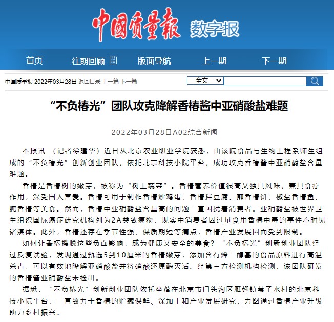 本報訊 (記者徐建華)近日從北京農業職業學院獲悉,由該院食品與生物工程系師生組成的“不負椿光”創新創業團隊,依托北京科技小院平臺,成功攻克香椿醬中亞硝酸鹽含量難題。