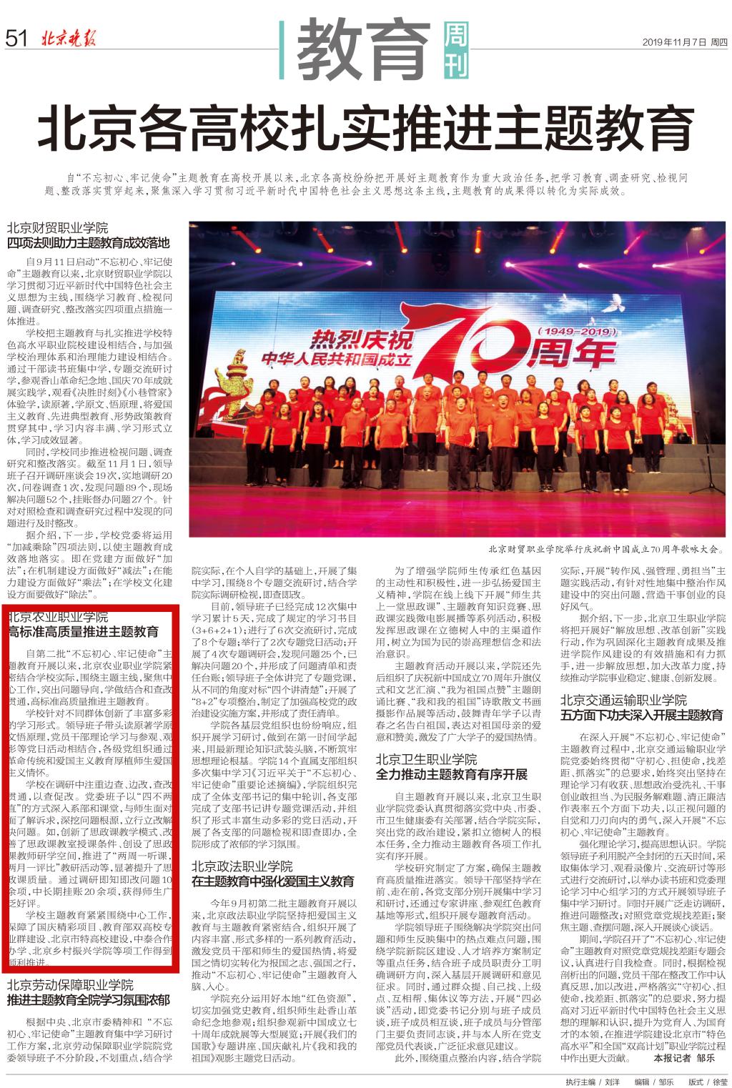 2019.11.7 北京晚報:北京各高校扎實推進主題教育——北京農業職業學院高標準高質量推進主題教育