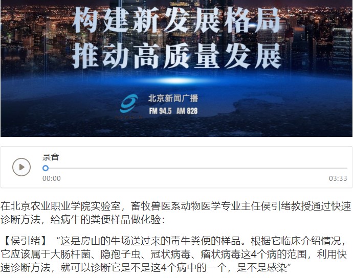 學院侯引緒教授多年來工作在教學科研與“三農”服務一線,為養殖戶提供技術服務,解決養牛過程中疑難雜癥,帶領學生到農場實踐,并把臨床研究經驗傳授給學生,真正做到“把論文寫在大地上”。12月29日,侯教授接受北京新聞廣播電臺采訪《科技賦能,北京助力“三農”發展》。媒體鏈接:https://mobile.tingtingfm.com/v3/app/toutiao/detail/xGo4PwGo0L
