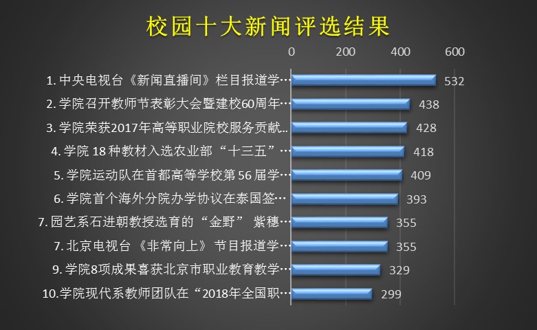 2018年度學院“十大新聞”正式揭曉。通過網絡公開投票評選,“中央電視臺《新聞直播間》欄目報道學院中學生學農工作”、“學院召開教師節表彰大會暨建校60周年辦學成果展”、“學院榮獲2017年高等職業院校服務貢獻50強和教學資源50強”等10條新聞入選,涵蓋學院教育教學、科研與培訓服務、學生活動、合作交流等諸多領域,全面展現了2018年學院各項事業發展成就和廣大師生良好的精神風貌。評選結果公布如下: