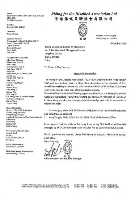 我院應香港傷健策騎協會邀請,擬于2018年12月17日-12月20日派出團組赴香港商談馬術學院實訓、教學基地建設、馬獸醫人才培養方案、學生實習、退役馬引入等相關事宜,在外停留時間4天。相關信息公示如下: