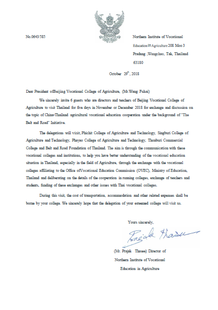 我院應泰國北部農業職業教育中心邀請,擬于2018年12月3日-7日派出團組赴泰國進行中泰職業教育合作訪問,在外停留時間5天。相關信息公示如下: