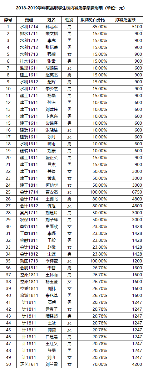2018—2019學(xué)年度高職學(xué)生校內(nèi)擬減免學(xué)雜費(fèi)明細(xì)公示說(shuō)明