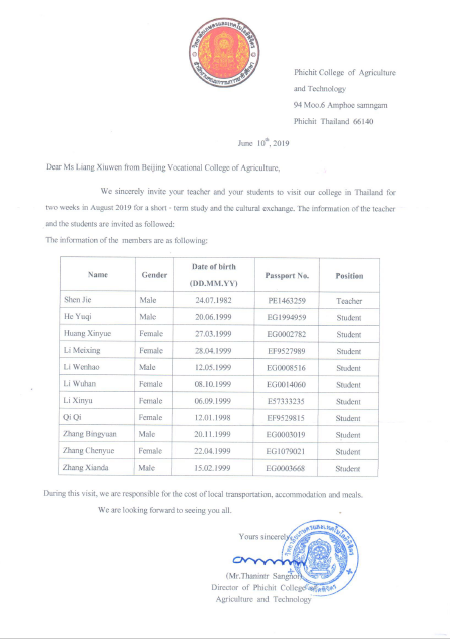 我院應(yīng)披集農(nóng)業(yè)技術(shù)學院邀請,擬于2019年8月18日-8月31日派出1名教師帶10名學生團組赴泰國進行泰語、泰國文化和農(nóng)業(yè)專業(yè)體驗活動,在外停留時間14天。