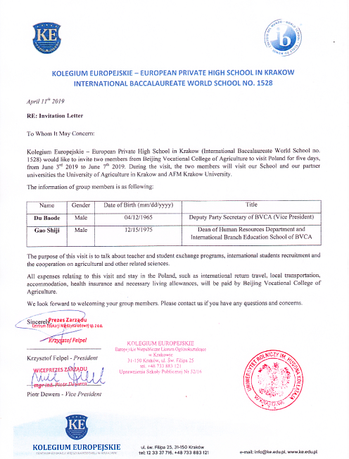 我院應波蘭歐洲學院國際學校邀請,擬于2019年6月3日至7日派出團組赴波蘭三所院校商談教師交流、學生交流、來華留學等事宜,在外停留時間5天。