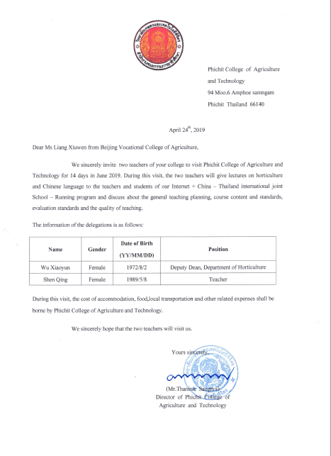 我院應(yīng)泰國分院披集農(nóng)業(yè)技術(shù)學(xué)院邀請(qǐng),擬于2019年6月16日-29日派出團(tuán)組赴我院泰國分院進(jìn)行講學(xué)及教學(xué)交流,在外停留時(shí)間14天。相關(guān)信息公示如下: