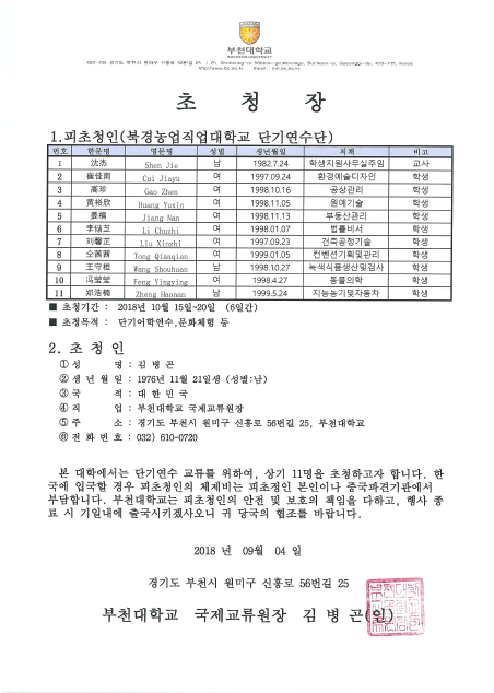 我院應韓國富川大學邀請,擬于2018年10月15日-20日派出1名教師帶10名學生團組赴該校進行專業及文化交流,在外停留時間6天。相關信息公示如下: