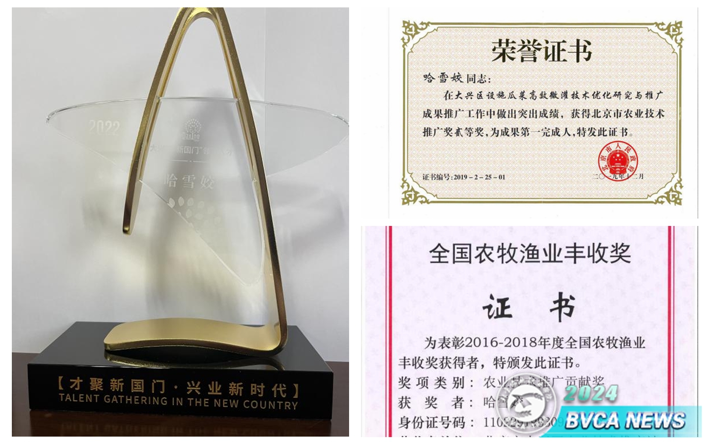 機(jī)會(huì)總是愿意給有準(zhǔn)備且付出努力的人。哈雪姣通過做試驗(yàn)、寫論文、考英語、考計(jì)算機(jī),一步一步地積攢資料,如期在2012年取得了農(nóng)藝師職稱,并一鼓作氣、一路沖刺,于2019年取得高級(jí)農(nóng)藝師職稱、2022年取得正高級(jí)農(nóng)藝師職稱。哈雪姣成為北京市大興區(qū)種植業(yè)技術(shù)推廣站最年輕的站長(zhǎng),她帶領(lǐng)團(tuán)隊(duì)刻苦鉆研,為大興西瓜選育新優(yōu)品種,成功促進(jìn)大興西瓜由中果型西瓜向高品質(zhì)小果型西瓜轉(zhuǎn)型,使大興“小吊瓜”品種和栽培技術(shù)引領(lǐng)全國(guó);自主創(chuàng)新設(shè)計(jì)“微灌溉施肥裝備”,獲專利兩項(xiàng)。她先后榮獲全國(guó)農(nóng)牧漁業(yè)豐收獎(jiǎng)、北京市農(nóng)業(yè)技術(shù)推廣獎(jiǎng)、大興區(qū)新國(guó)門領(lǐng)軍人才、大興區(qū)優(yōu)秀青年人才等多個(gè)獎(jiǎng)項(xiàng),碩果累累。
