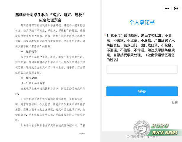 在制定應(yīng)急預(yù)案的同時(shí),基礎(chǔ)部學(xué)辦輔導(dǎo)員與全體學(xué)生簽署個(gè)人承諾書,嚴(yán)格落實(shí)個(gè)人防控責(zé)任,強(qiáng)調(diào)未經(jīng)學(xué)校批準(zhǔn)不離家(不離京),不返京,不返校,教育學(xué)生注重個(gè)人誠信,及時(shí)認(rèn)真填報(bào)疫情期間個(gè)人健康狀況及位置信息,做到不錯(cuò)報(bào)、不瞞報(bào)、不漏報(bào),少出門、出門戴口罩,不聚會(huì),不造謠、不信謠、不傳謠。