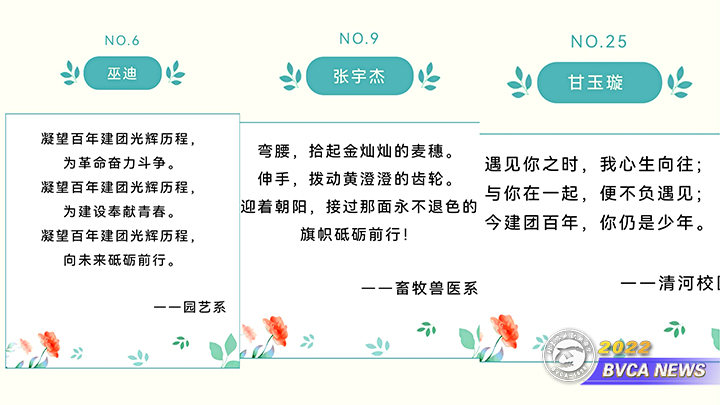 征集活動(dòng)發(fā)布后,各級(jí)團(tuán)組織積極動(dòng)員團(tuán)員青年參與,共征集原創(chuàng)作品100余篇,經(jīng)遴選共30位首優(yōu)秀作品入圍投票環(huán)節(jié)。同學(xué)們通過(guò)青春農(nóng)職微信公眾平臺(tái)共讀“情書(shū)”,感受廣大團(tuán)員對(duì)共青團(tuán)的青春告白,領(lǐng)略中國(guó)詩(shī)歌的獨(dú)特魅力,參與投票人數(shù)達(dá)1700余人。最終,園藝系巫迪同學(xué)的作品獲得一等獎(jiǎng),牧醫(yī)系張宇杰、清河校區(qū)甘玉璇等5名同學(xué)的作品獲得二等獎(jiǎng),食生系金澤源、經(jīng)管系藺莎莎等10名同學(xué)的作品獲得三等獎(jiǎng)。