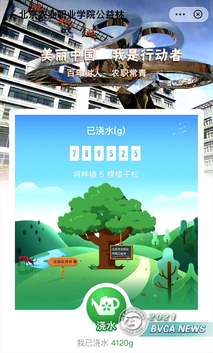 2020年初,為響應北京市人民政府辦公廳關于印發《北京市藍天保衛戰2018年行動計劃》通知要求,傳承共青團自上世紀50年代以來積極發動青少年植樹造林活動的歷史,進一步動員全院青年學生積極參與生態文明建設,讓廣大青年學生自覺踐行綠色生產和生活方式,院團委組織全院學生參與共青團北京市委員會大學中專工作部、北京市學生聯合會秘書處與北京市環境保護宣傳中心動員首都高校開展共建“青春北京”公益林活動。此次公益活動依靠螞蟻金服集團“螞蟻森林”線上平臺,共建“青春北京”公益林,推動“藍天保衛戰,我是行動者”活動落地,為生態文明建設貢獻青年力量。