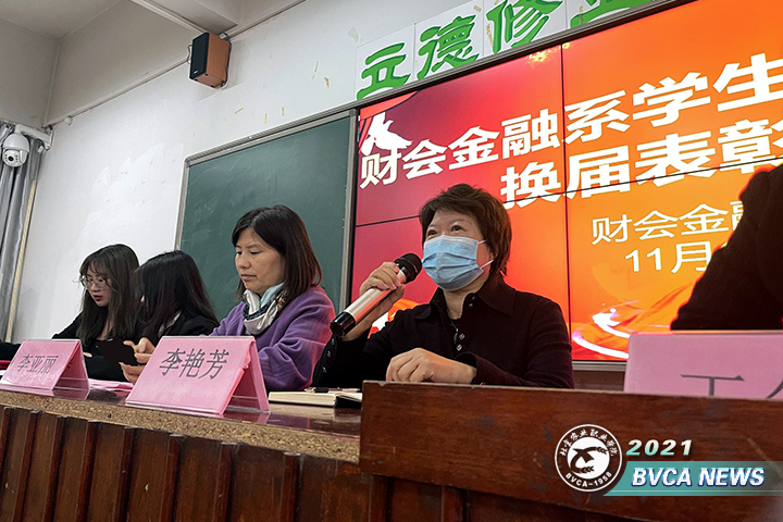 系黨總支書記李艷芳做總結發(fā)言,充分肯定了上屆學生會的工作成績,對新一屆學生干部表示祝賀并提出殷切希望。號召同學們全力支持學生干部工作,在和諧宿舍創(chuàng)建、校園疫情防控、垃圾分類等各項工作中群策群力,維護好財金系優(yōu)良的系風學風。特別強調,學習是第一要務,希望學生干部們珍惜在校時間,鍛煉自己的綜合素養(yǎng),為將來就業(yè)打下基礎。