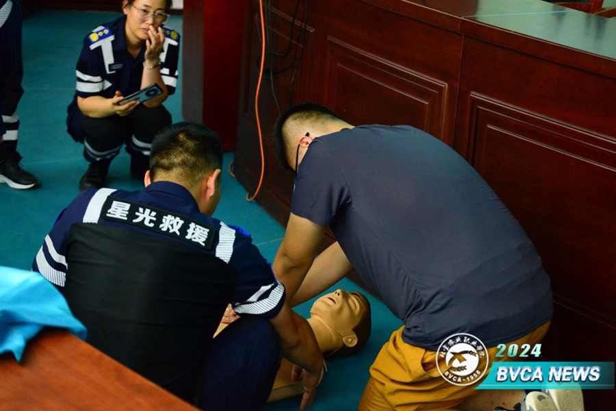 隨后,房山區(qū)星光救援隊(duì)的成員向大家示范講解了心肺復(fù)蘇的操作方法。在救援隊(duì)員的現(xiàn)場(chǎng)指導(dǎo)下,學(xué)生使用假人進(jìn)行實(shí)操急救技巧。