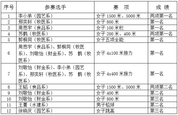 我院田徑隊被組委會授予最佳參賽組織獎,并獲得女子團(tuán)體第一名、男子團(tuán)體第八名、團(tuán)體總分第一名的好成績。選手個人也成績優(yōu)異。