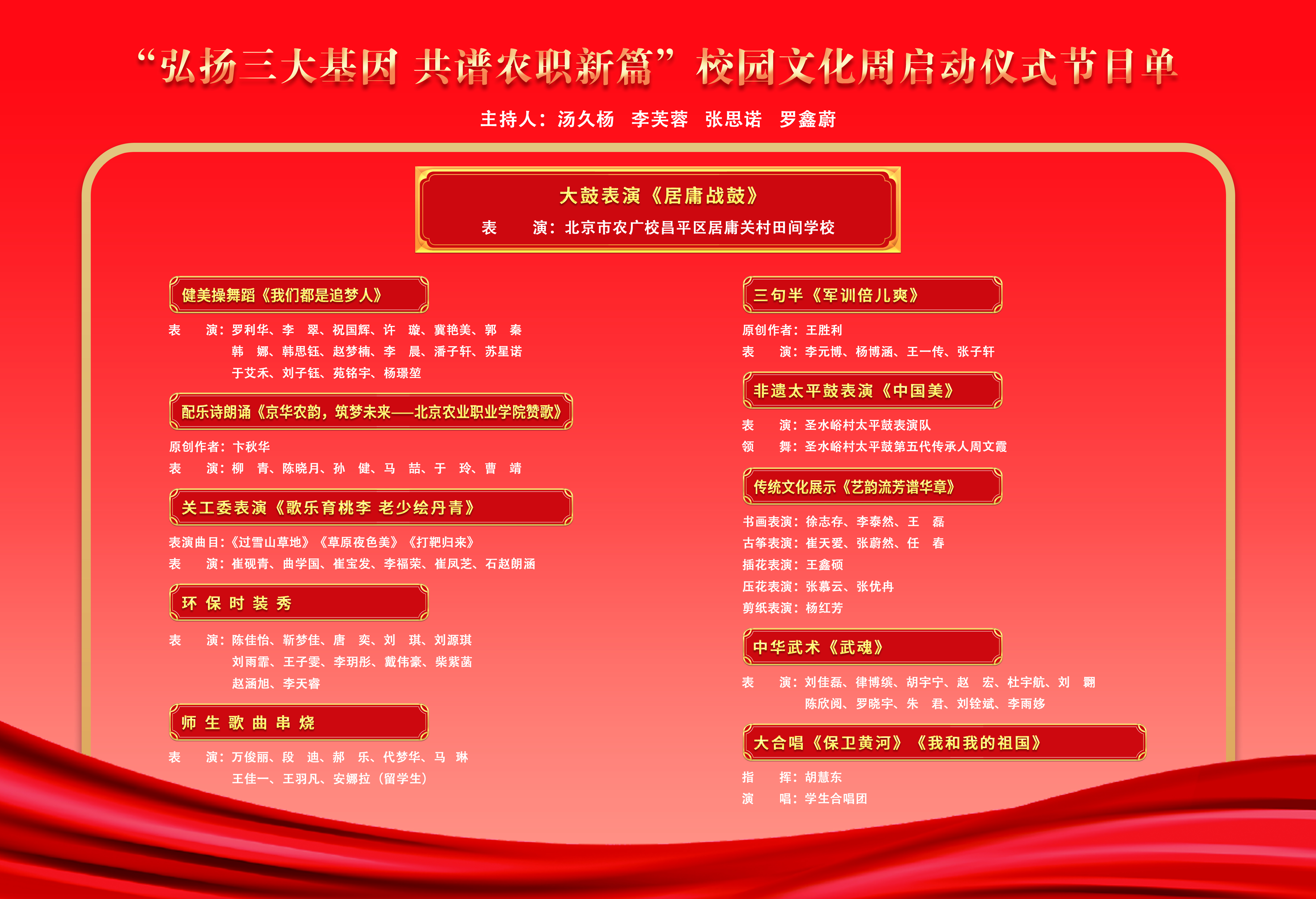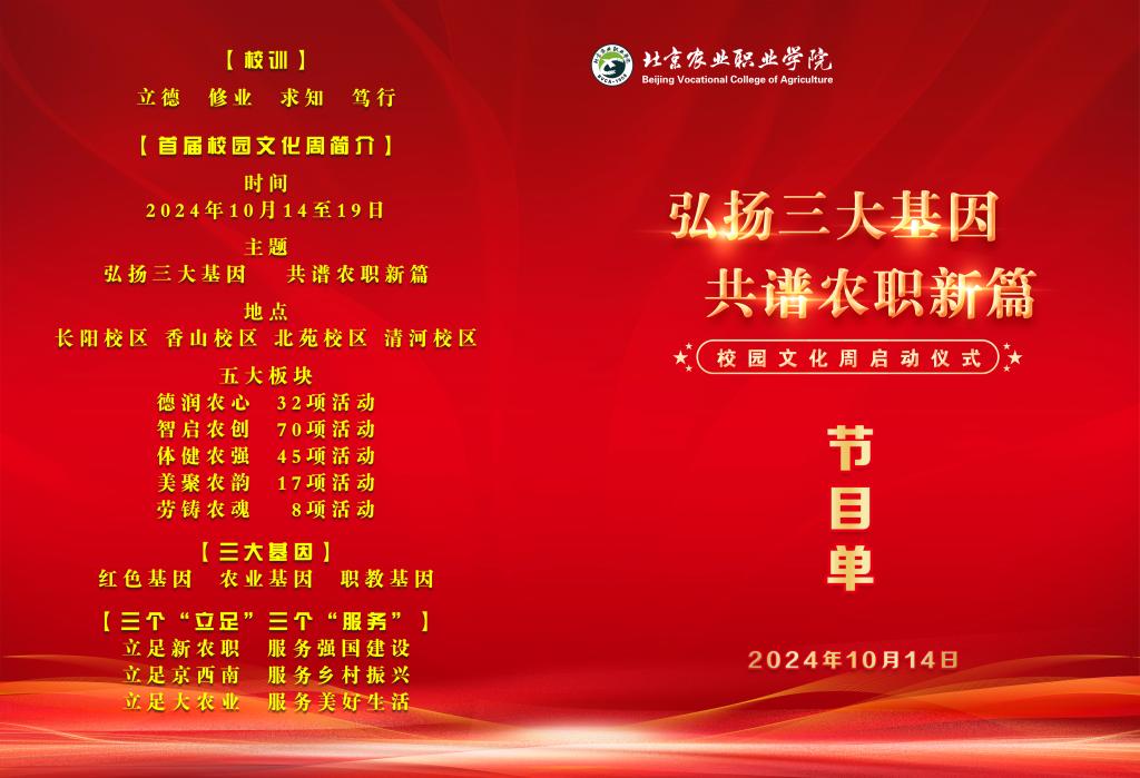 10月14日上午,學(xué)校“弘揚(yáng)三大基因 共譜農(nóng)職新篇”校園文化周啟動。學(xué)校黨政領(lǐng)導(dǎo)、四校區(qū)師生、離退休教職工和京宛合作南陽農(nóng)業(yè)職業(yè)學(xué)院師生代表通過現(xiàn)場和視頻直播形式參加。