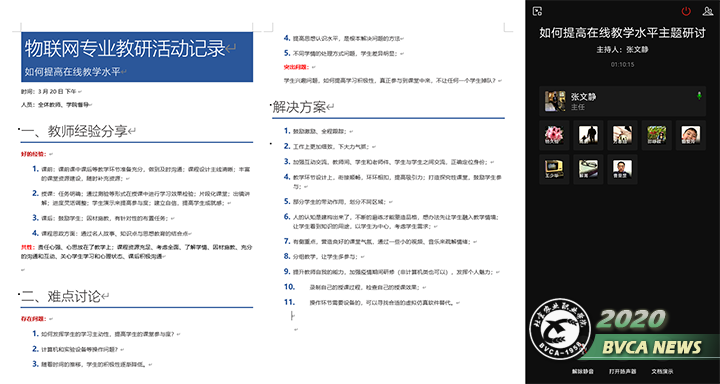 教研活動上,物聯網專業教師分別就在線教學的基本情況,教學中的方法、經驗、問題和難題進行了匯報。在討論中,大家毫無保留的分享了教學中的有效方法,就如何利用現有條件做到因材施教,想學生之所想,關心關愛學生等具體情況作了交流。圍繞如何更有效地組織教學,提高學生的參與度進行了討論,并總結出十條解決方法和途徑。