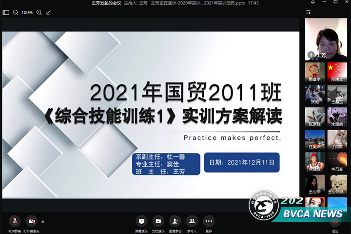 12月13日起,經濟管理系國貿2011班進入6家校企合作企業,開啟為期兩周的校外“綜合技能訓練”。12月11日晚,國貿2011班召開線上家長會,解讀《綜合技能訓練1》訓練方案,系副主任杜一馨、專業主任、班主任以及17位學生家長參加會議。