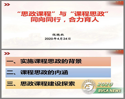 馬杰老師首先闡述了實施課程思政的重要意義,以及教師立德樹人的任務和教書育人的責任。倪艷秋老師從實施課程思政的背景、課程思政的內涵和思政課程建設探索三個方面進行了以《“思政課程”與“課程思政”同向同行,合力育人》為題的匯報。