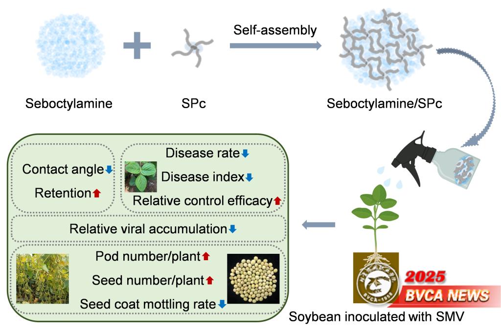該研究成功設計開發了一種具有強粘附性能的自組裝納米抗病毒農藥,大幅改善了農藥的理化性質并提升農藥分子的遞送效率,顯著提升了大豆花葉病毒(SMV)的田間防治效果,為SMV的防治提供了新的方法策略。