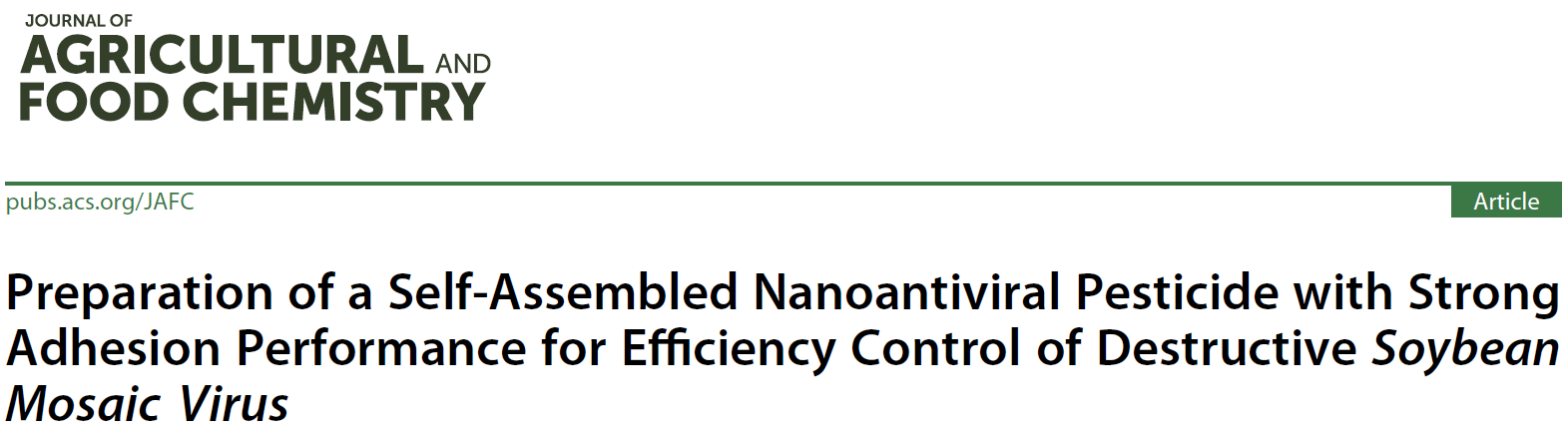 近日,我校園藝園林學院高樂副教授以第一作者身份在國際知名期刊《Journal of Agricultural and Food Chemistry》(農業與食品化學雜志,1區,IF=5.7)發表了題為“Preparation of a self-assembled nanoantiviral pesticide with strong adhesion performance for efficiency control of destructiveSoybean mosaic virus”(一種具有強粘附性能的自組裝納米抗病毒農藥的制備,用于有效控制破壞性大豆花葉病毒)研究論文。