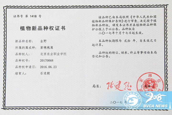近日,我院園藝系石進朝教授選育的“金野”紫穗槐被國家林業(yè)局授予植物新品種權(quán)(國家林業(yè)局公告,2017年第17號),這是我院第二個報審并通過授權(quán)的植物新品種(品種權(quán)號:20170068)。