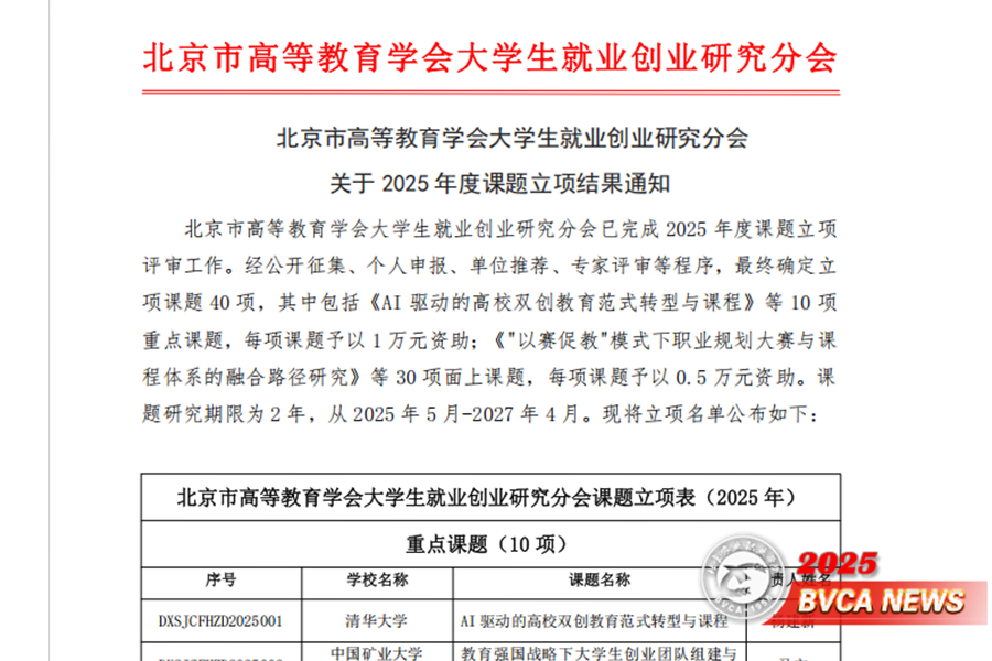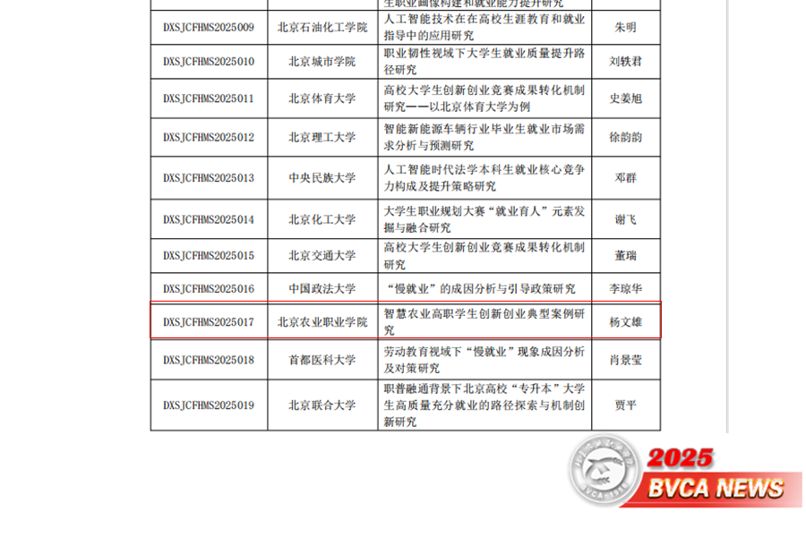 近日,北京市高等教育學會大學生就業創業研究分會公布了2025年度課題立項結果,全市共立項40項課題。我校楊文雄副教授申報的《智慧農業高職學生創新創業典型案例研究》成功獲批立項,成為本年度唯一獲批的北京職業院校課題,實現了我校在就業創業科研領域的重要突破。