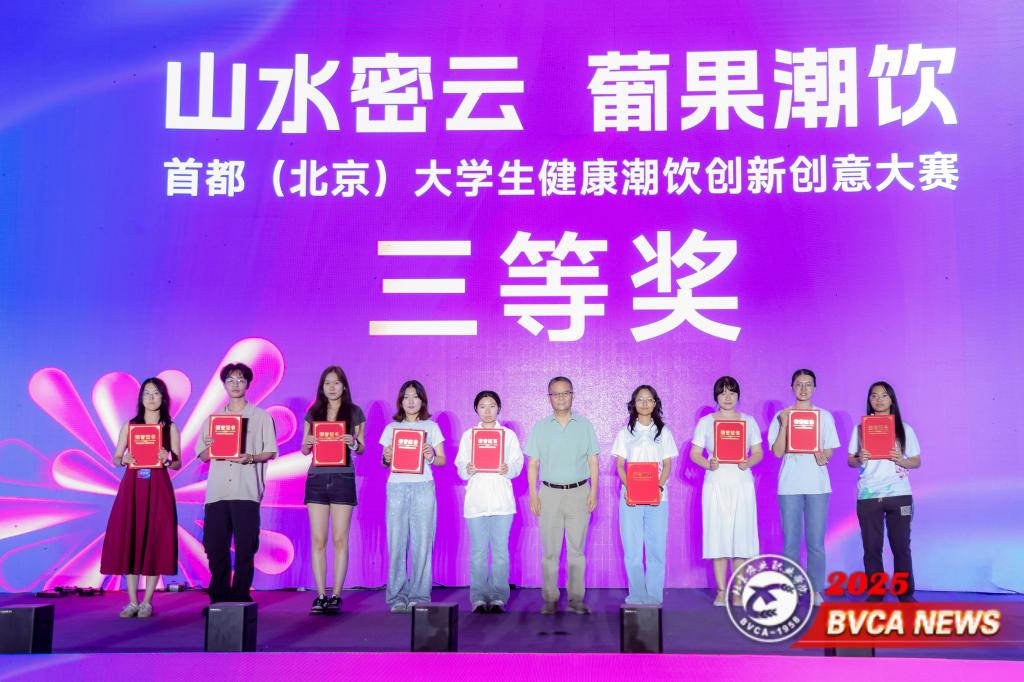 本次大賽由北京林業大學承辦,我校楊新建副院長與汪長鋼老師全程協調組織。參賽團隊以密云葡萄酒為基底,融入低糖、益生菌、功能果粉等健康元素,調制出《葡趣實驗室》、《葡萃新生》兩款創意潮飲,贏得評委與觀眾點贊。