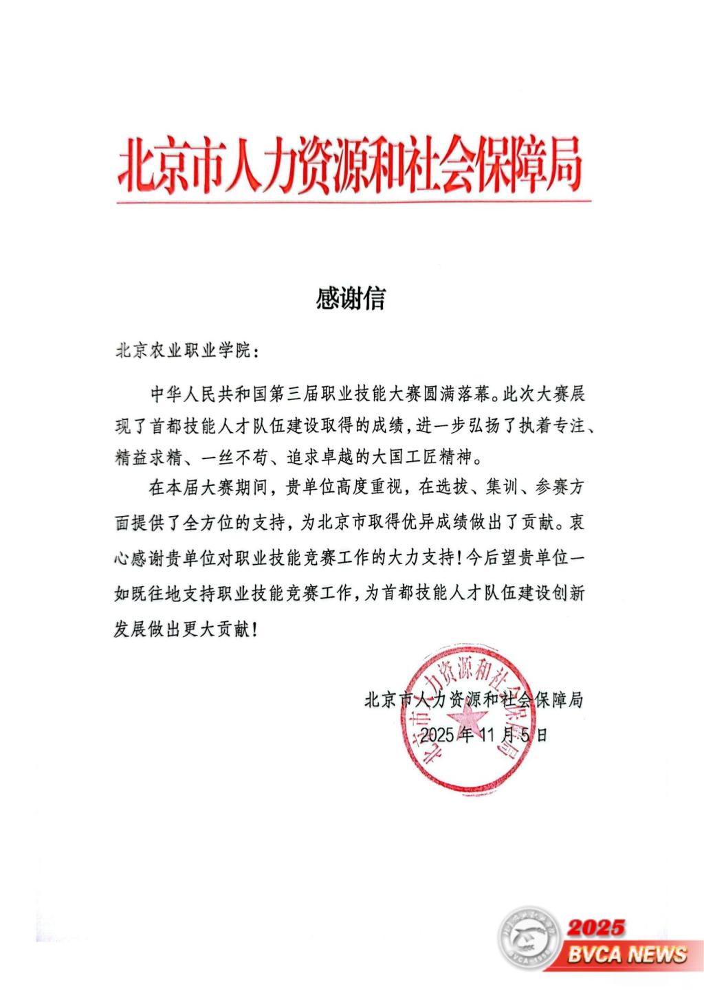 近日,北京市人力資源和社會(huì)保障局向我校發(fā)來感謝信,對我校在中華人民共和國第三屆職業(yè)技能大賽所承擔(dān)的農(nóng)機(jī)智能化技術(shù)與砌筑兩個(gè)賽項(xiàng)的技術(shù)服務(wù)工作表示高度認(rèn)可與衷心感謝。