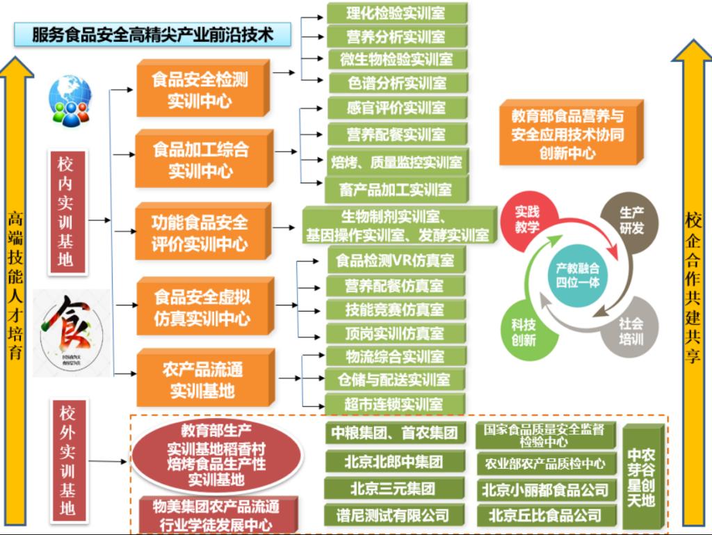專業群以產教融合、服務行業企業技術需求為導向,建成集教學、培訓、研發、應用于一體的校內外共享實訓基地。校內實訓基地總面積約6000平方米,資產總值約5900萬元,包括食品安全檢測實訓中心、教育部食品營養與安全應用技術協同創新中心、食品加工綜合實訓中心,食品安全虛擬仿真實訓中心,功能食品安全評價中心、農產品流通校內實訓基地,建設色譜分析、虛擬仿真、營養配餐、感官評價、倉儲等實訓室26個。配置高效液相色譜儀、氣質聯用儀等大型高端設備,開發VR 6套及虛擬仿真20多套;與校外實訓基地緊密合作,擁有教育部稻香村焙烤食品實訓基地,教育部現代學徒制項目“農產品流通行業學徒培訓中心”,與中糧集團、北京物美集團等50余家大型企業開展實習實訓、技術研發,形成支撐食品安全專業群實踐育人產教融合基地,成為現代學徒制中締結校企命運共同體的主要抓手,探索以評聘制度改革實現校企人才雙向流動,為教育部“1+X”證書試點工作儲備了場所、人員、設備等優質資源。