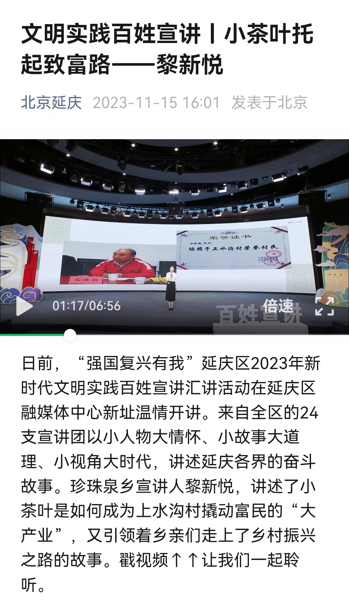 11月15日 北京延慶視頻號:《小茶葉托起致富路》,珍珠泉鄉宣講人黎新悅,講述了學院石進朝教授助力鄉村振興,讓小茶葉變身為撬動富民“大產業”的故事。