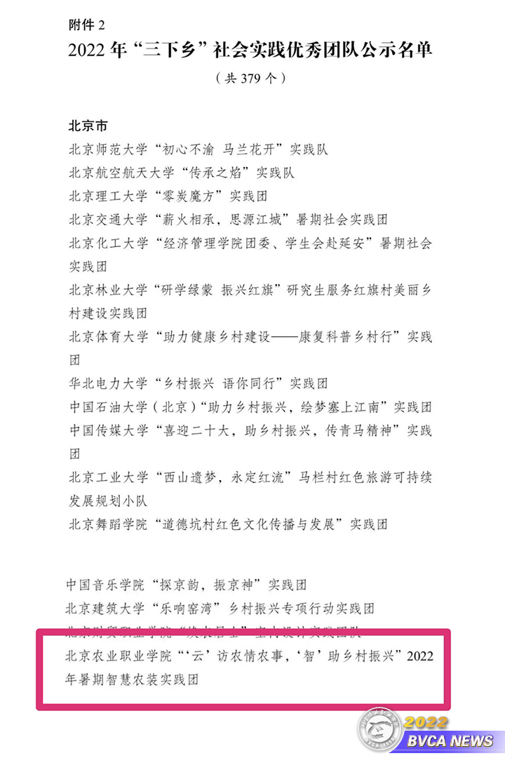 近日,共青團(tuán)中央公布了全國(guó)在2022年“三下鄉(xiāng)”社會(huì)實(shí)踐活動(dòng)中表現(xiàn)突出的優(yōu)秀集體、個(gè)人和項(xiàng)目。我院清河校區(qū)“‘云’訪農(nóng)情農(nóng)事,‘智’助鄉(xiāng)村振興”2022年暑期智慧農(nóng)裝實(shí)踐團(tuán)榮獲優(yōu)秀團(tuán)隊(duì)榮譽(yù)稱號(hào)。