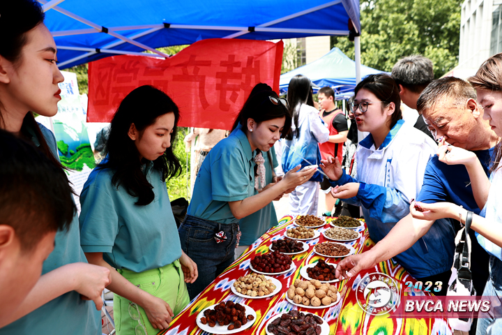 活動第一站,新疆藝術學院“石榴籽 祖國行”融情實踐團開展新疆特色市集巴扎,熱情大方地向我院師生展示新疆文化歷史、美景美食。師生們紛紛駐足,品嘗新疆特色美食、試穿新疆民族服飾、參與新疆知識有獎問答,并加入跳舞隊伍,與新疆師生一起載歌載舞,現場歡呼聲和掌聲此起彼伏,氣氛熱烈歡快。