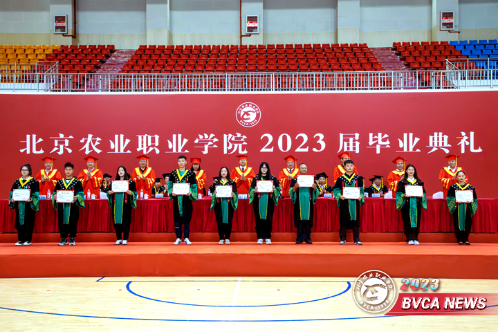 周志成、范雙喜及主席臺領導分別為北京市優秀畢業生代表、畢業生代表和獲獎畢業生代表頒發證書。