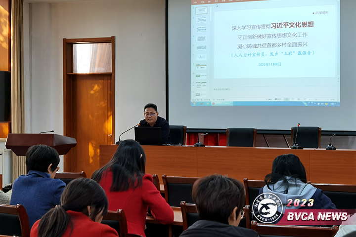 為深入學(xué)習(xí)宣傳貫徹習(xí)近平文化思想,貫徹落實全市思想文化工作會議精神,做好新形勢下學(xué)院宣傳思想文化工作,提高全院宣傳員隊伍思想政治素養(yǎng)和業(yè)務(wù)水平,11月8日下午,學(xué)院在長陽校區(qū)圖書館學(xué)術(shù)報告廳開展了2023年宣傳員培訓(xùn)。北京市委農(nóng)工委宣傳與文化處處長顧崇華受邀作《深入學(xué)習(xí)貫徹習(xí)近平文化思想 守正創(chuàng)新做好宣傳思想文化工作 凝心鑄魂共促首都鄉(xiāng)村全面振興》主題講座。講座由學(xué)院黨委常委、宣傳部部長趙章彬主持。全體宣傳員和部分學(xué)生代表參加培訓(xùn)。