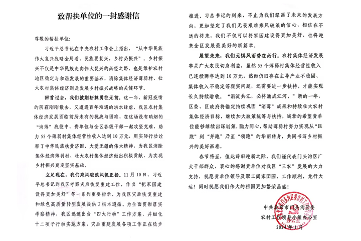 近日,門頭溝區(qū)委農(nóng)村工作領(lǐng)導(dǎo)小組辦公室向我校發(fā)來一封感謝信,信中對我校在幫扶門頭溝區(qū)集體經(jīng)濟(jì)薄弱村工作中所作出的貢獻(xiàn)表示衷心感謝。