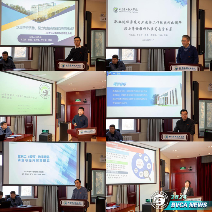 各小組分別從《鞏固傳統優勢,聚力培植高質量發展新動能——以教科研名師隊伍培養為例》《職業院校涉農專業教師工作現狀對比調研,助力學校教師隊伍高質量發展》《培養新時代“農職”特色高素質人才》《本科層次職業教育專業申報可行性研究》《教職工(教師)數字素養調查與提升對策研究》《篤農強技--提升實踐性教學實效調研》六個角度匯報了課題研究情況,分析了學校現狀、制約高質量發展存在的問題及解決對策與建議。