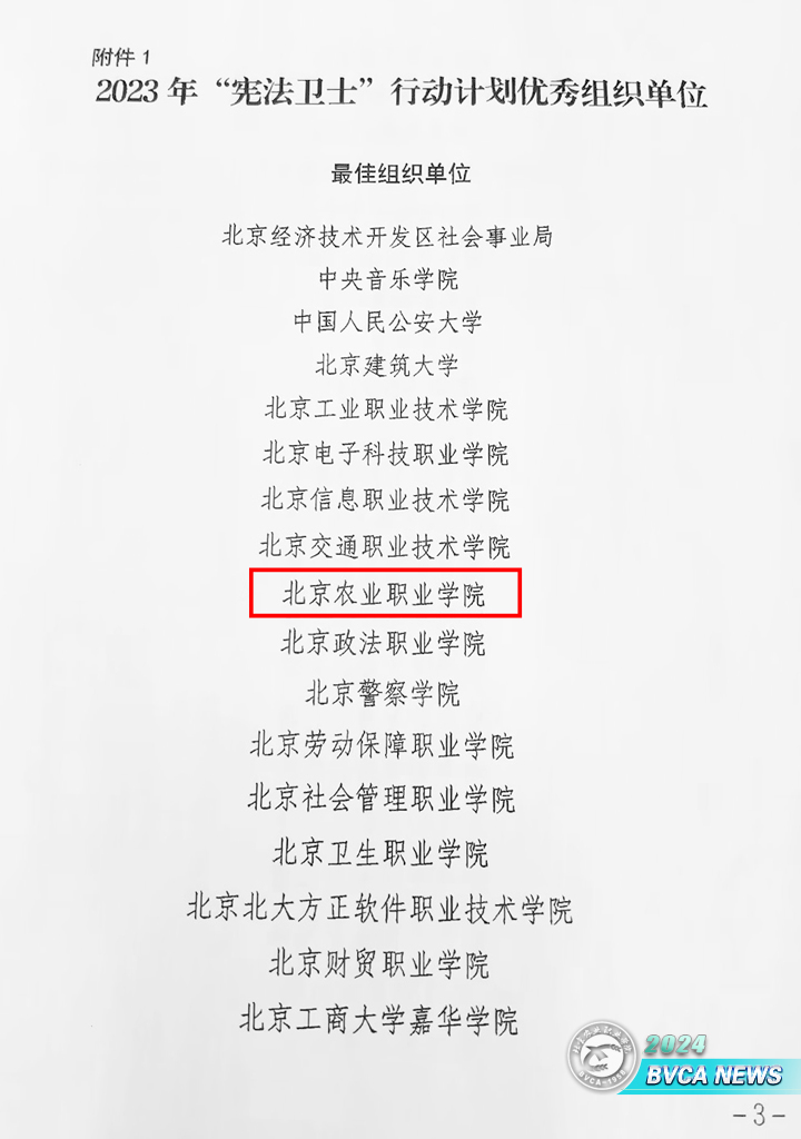 近日,北京市教委發文通報2023年全市學生參與“學憲法 講憲法”系列活動情況,公示“憲法衛士”行動計劃表揚名單,北京農業職業學院榮獲2023年“憲法衛士”行動計劃優秀組織單位。