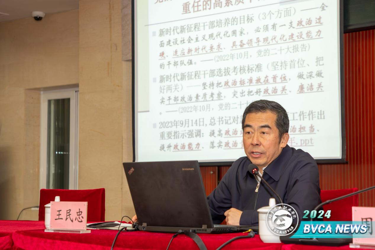 4月10日上午,學校召開黨委理論學習中心組學習(擴大)會議,邀請市政協委員、學習委員會副主任,北京市委黨校(北京行政學院)原常務副校長(副院長)王民忠教授作意識形態專題報告。黨委書記周志成主持會議。
